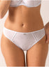 This thong is made of printed fabric in the front with a small central openwork piece and an unexpected embroidered detail in the back.