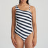 Stylish one-shoulder swimsuit with flirty diagonal stripes. While it does not have underwire, this swimsuit does have padded cups. The asymmetrical style also features a removable strap. Cloud Party is a playful combination of fresh, intertwining shades of blue that make it dynamic and fun.