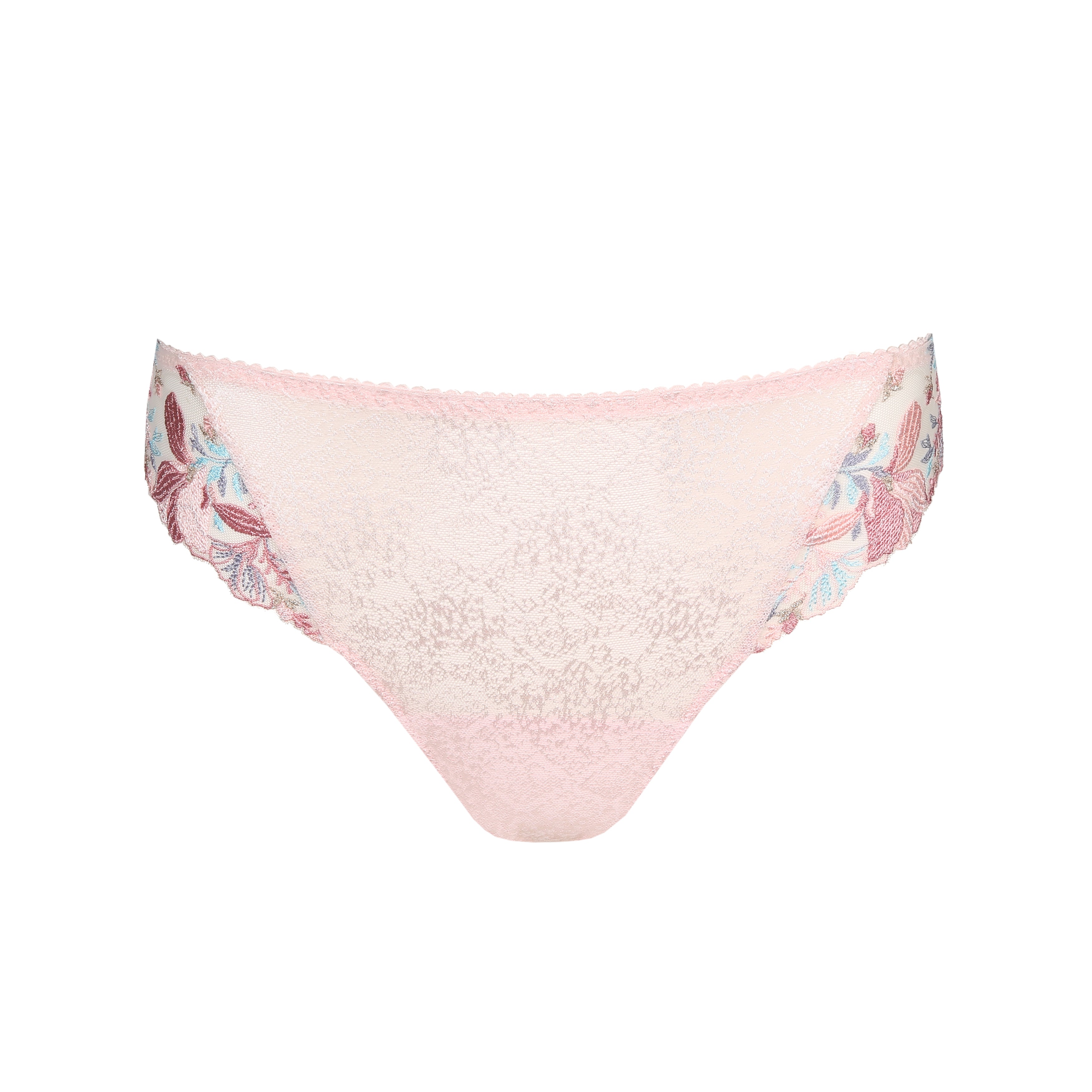 Shiny, opaque thong in a lace textured fabric and elegant embroidery on the legs. Pastel Pink is a feminine mix of pale blue, pastel pink, and a dusty pink color with a romantic feel.