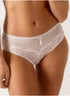 Красивая вставка из тюля, вырезанная на кончике, моделирует и облегчает переднюю часть этой ультракомфортной вещи. Нежное кружево подчеркивает талию спереди и сзади, а атласный бантик придает элегантный завершающий штрих этим красивым объемным трусам.